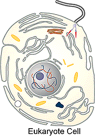 . The figures above show two major types of cells - eukaryote and prokaryote. Notice the eukaryote contains many structures in its cytoplasm - red and blue linear structures represents DNA; whereas the prokaryote cell contains relative few structures in its cytoplasm - 1 = circular DNA, 2 = cell membrane, 3 = cytoplasm with ribosomes. The prokaryote cell is not only simpler than the eukaryote cell but it is also more primitive. Two prokaryote cell types you may be familiar with are unicellular bacteria and cyanobacteria (blue green algae). By the mid 1800s several naturalists had examined cells of plants and animal and reported similarities between all cells types. From the observations three principles of the cell theory evolved. These naturalists were Robert Hooke 1665, Anton van Leeuwenhoek 1673, Theodor Schwann 1839, Mattias Schleiden 1850 and Rudolf Virchow 1850. The principles of the cell theory are: A. Every living thing is composed of one or more cells. B. The smallest living organisms are single cells, and cells are the