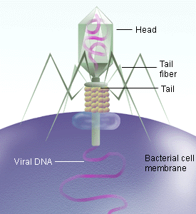 Living organisms consist of two fundamentally different cells types: prokaryotic and eukaryotic. Readings from B-2. Prokaryotes are much more primative and structurally more simple compared to eukaryote organisms. Prokaryote cell types appeared on the Earth some 3.5 billion years ago during the precambium era. Approximately 1.4 billion years ago the first eukaryote cell type appeared on Earth. A more detailed comparison beteen these two cell types will be examined later in this miniunit. These Prokaryotes (organisms consisting of prokaryote cell types) include the bacteria (heterotrophic nutrition) and cyanobacteria (autotrophic nutrition). Heterotrophic nutrition refers to organisms that acquire their biological energy and organic carbon for growth from other organisms. You have heterotrophic nutrition. Autotrophic nutrition refers to organisms that can synthesize their own energy rich molecules from energy poor molecules. They are not dependent on other organisms for a source of biological energy and organic carbon. The most common autotrophic organisms are those that contain chlorophyll and carry out photosynthesis. You may want to go back to miniunit alpha and review the section on "characteristics of life - metabolism". Eukaryotes (organisms consisting of eukaryote cell types) include all other living forms of life which you are familiar such as: amoeba, paramecium, mosses, fungi, plants and animals. Eukaryote cells can further be classified as plant cell types, animal cell types, protista cell types and fungi cell types. You will learn the differences between plant and animal cells types in this miniunit and differences in protista and fungi cell types in a later miniunit. Viruses are organisms that consists primarily of DNA or RNA molecules wrapped in a protein coat. These organisms can only replicate within a specific host cell by directing the machinery of that cell to synthesize viral nucleic acids and proteins. Since viruses can not grow or replicate outside of a cell and do not contain a cell membrane, they are not considered to be alive in the usual sense. Study the figure below showing a virus attacking a bacterial cell and placae in your notes.