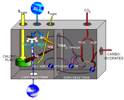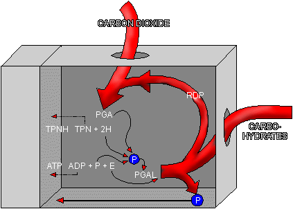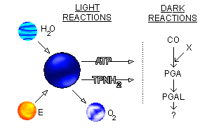 This illustration shows the appearance of the closed box of photosynthesis at the conclusion of the light reactions. You will remember that the light dependent reactions studied in the previous web pages (photolysis and direct ATP production) required the absorption of light energy. Carbon dioxide fixation, the second phase of photosynthesis, does not require light energy and therefore can occur in the light or dark. Because of their independence from light, the chemical reactions of carbon dioxide fixation are termed dark reactions. 1. How do light reactions and dark reactions differ? Click here to check answer. click