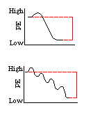 In cellular respiration, the energy of the organic molecules which store energy must be released in a highly controlled manner. The illustration to the left represents the difference between the energy-release processes of cellular respiration and wood burning. Click on the energy diagram which represents "the burning of wood." Cellular respiration involves a step-by-step release of energy as its high-energy reactant molecules are converted to low-energy product molecules. The high-energy reactant molecules of this process are termed organic fuels. Fats, carbohydrates, proteins, and many other organic molecules high in energy content can serve as organic fuels in the cellular respiration process. The carbohydrate molecule glucose will be used in the following chapters of this book as a simple organic fuel to illustrate the details of the process. You should remember that sugars, starches, and cellulose are all carbohydrates with the simplified formula [CH20]n, where the "n" symbolizes that CH20 is contained in the molecule a number (n) of times. Glucose is a kind of sugar, so you know that glucose is also a carbohydrate. Glucose, like other carbohydrates, is produced in the process of photosynthesis. It is an organic fuel in which energy from the sun is incorporated as chemical energy. A molecule of glucose (C6H1206) contains twenty-four atoms-- 6 carbon, 12 hydrogen, and 6 oxygen. Which carbohydrate formula listed is the appropriate one for glucose? (Click one.) During the process of cellular respiration, the chemical energy in glucose is released and made available for cellular use. Several kinds of energy-releasing chemical reactions are employed to achieve this end. But, in every case, each energy-releasing chemical reaction involves the formation of product molecules which are (lower/higher) in chemical energy content than the reactant molecules.