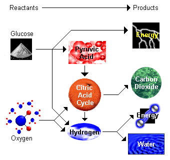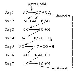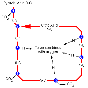 Since the citric acid is regenerated in the process, we need to focus our attention on the other reactant (pyruvic acid) and the products of the seven reactions. Study the figure indicated by E-11. Three carbon atoms enter the reactions in a molecule of pyruvic acid. Three carbon atoms leave the reactions in molecule of carbon dioxide. It is clear the pyruvic acid molecule supplies all of the carbon and hydrogen necessary for the reactions. You can see from the bookkeeping of atoms that pyruvic acid has been completely broken down (all atoms have been transferred to product substances) by Step 7 of the process. The carbon and oxygen atoms have been given off to the environment in the form of carbon dioxide. The hydrogen atoms have been freed from the pyruvic acid molecule. What do you predict is their eventual fate in oxidative respiration? Answer: They will be oxidized to form water, since oxygen is available for the process. The reaction will liberate a lot of energy. This occurs in the cytochrome electron transport system which will be investigated on the next web page. In cellular respiration, glucose is converted into pyruvic acid molecules (glycolysis) with an accompanying release of energy. Then the pyruvic acid molecules are further broken down through a cycle of chemical reactions (Krebs Cycle). This set of reactions is usually called the citric acid cycle, but it may also be termed the Krebs Cycle or tricarboxylic acid cycle. The illustration below demonstrates the cyclic nature of the process, as the citric acid enters the reaction in the second step and is regenerated in the seventh step.