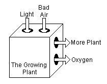 Stale air should be changed to carbon dioxide. You will recall from Priestley's experiment that the vegetation was able to "restore" the bad air by generating oxygen. Living animals and burning candles are now known to consume oxygen and generate carbon dioxide. It appears that (in the presence of light) living plants consume _____ and generate _____. Answer: carbon dioxide; oxygen The presence of both plant and animal in the jar in Priestley's experiment may have been beneficial to the plant as well as to the mouse! But does a plant require materials other than just light and carbon dioxide for the conduction of photosynthesis? At the time the basic experimentation on photosynthesis was being conducted (the late eighteenth century), it was still commonly thought that the plant took materials from the soil and built them into its own structure. A scientist named Johannes van Helmont decided to test this idea by growing a tree in a very carefully weighed quantity of soil (2 pounds). After the tree had grown quite large, he again weighed the soil and found that although the tree had gained many pounds of weight (200 pounds), the weight of the soil had decreased by only a few ounces. It was clear that only a small proportion of the weight of the plant could be attributed to soil. (As a matter of fact, plants today can easily be grown hydroponically with no soil!) In 1804, a Swiss scientist, Nicholas Theodore de Saussure, by means of further carefully conducted experiments concerning the weight of plants, found that plants carrying on photosynthesis increased in weight by more than the amount of carbon dioxide they consumed. He knew that this difference in weight could not be accounted for by the amount of soil the plant used. Think about plants. What is the one thing that most plants appear to take in a lot of, which is quite heavy, and could be used in photosynthesis? Answer: Water. Nicholas de Saussure thought of water, too, and by precise measurements on plants was able to demonstrate that water was used by plants in photosynthesis. The mysterious closed box called the plant was certainly starting to reveal some of its secrets. By 1800 the use of primitive microscopes had enabled the close examination of a variety of plant and animal tissues, and knowledge about the basic structures of plants and animals had grown rapidly. In 1824, R. J. H. Dutrochet began comparing the structure of plant and animal tissues. He was a careful observer, and he stated with accuracy: " . . . all the organic tissues of animals are really globular cells of extreme smallness, which are united only by cohesion. Thus, all the tissues, all the organs of animals and plants are really only a cellular tissue diversely modified."Building on this idea, Theodor Schwann and Matthias Schleiden stated that cells make up the basic structure of all living things and that these cells act independently yet function together as a unit. This basic idea, that cells make up all living things, is now called the Cell Theory. With the discovery of cells, curiosity about the mechanisms of plant growth immediately became curiosity about how cells consumed light energy, carbon dioxide, and water to produce more cells and give off the waste product of oxygen. Our closed box which represented the plant now becomes a closed box which represents one plant cell. 14. Instead of drawing a picture of the closed box when we want to illustrate the process of photosynthesis, we can use a reactant/product expression as shorthand.