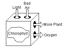 Here is the shorthand equation for the same process: In this equation the chlorophyll is placed above the arrow because it is necessary for the reaction, but it is not used up in the reaction. It is neither a reactant nor a product, but it acts like a chemical stimulant to the reaction. The chlorophyll causes the reaction to occur. Chemicals of this type are very common in biological systems. In this reaction (click one): You are now at a point in your understanding of photosynthesis where you know what materials enter a plant cell and what materials leave a plant cell. You are, in a way, in the position of a person who lives across the street from a small automobile factory. Each day this person sees raw materials such as iron, glass, paint, cloth, and coal enter the factory and sees finished cars leave the factory. The person can live across from the factory all his life and never know what happens inside the factory. The raw materials and the end product may be well known, but the inside of the factory is still a "closed box" for the person. The raw materials of carbon dioxide, water, and light energy go into the plant, and the finished product of more plant materials exits from the cell along with the waste material of oxygen gas. But what happens inside the cell? What is the role of chlorophyll in the manufacturing process? What does the assembly line for the finished product look like? This is the end of lesson nine . Click here to go back