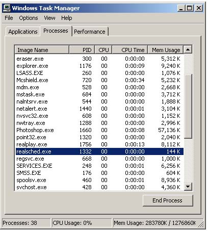 Before you can rename the realsched.exe file, you must first make sure it's not running. Using the Windows Task Manager, select the application and then click "End Process."