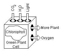 Here is the shorthand equation for the same process: In this equation the chlorophyll is placed above the arrow because it is necessary for the reaction, but it is not used up in the reaction. It is neither a reactant nor a product, but it acts like a chemical stimulant to the reaction. The chlorophyll causes the reaction to occur. Chemicals of this type are very common in biological systems. In this reaction (click one): You are now at a point in your understanding of photosynthesis where you know what materials enter a plant cell and what materials leave a plant cell. You are, in a way, in the position of a person who lives across the street from a small automobile factory. Each day this person sees raw materials such as iron, glass, paint, cloth, and coal enter the factory and sees finished cars leave the factory. The person can live across from the factory all his life and never know what happens inside the factory. The raw materials and the end product may be well known, but the inside of the factory is still a "closed box" for the person. The raw materials of carbon dioxide, water, and light energy go into the plant, and the finished product of more plant materials exits from the cell along with the waste material of oxygen gas. But what happens inside the cell? What is the role of chlorophyll in the manufacturing process? What does the assembly line for the finished product look like? This is the end of lesson nine . Click here to go back