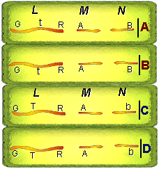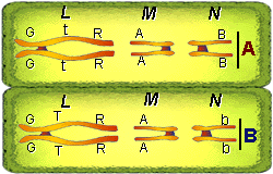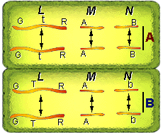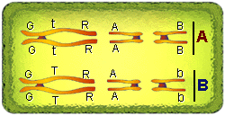 "G, T and R" are on one pair, gene "A" on the second pair and "B" on the