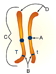 Examine the figures shown in the readings indicated by G-1 concerning centromeres and chromatids. In the figure below identify the structures: centromere, chromatids, and sister chromatids. These are the structures that make up a chromosome. Review the difference between chromosome and chromatin. The figure below represents one homologous pair because the genes "T and t" are located at the same site (loci) of both chromosomes. Also note that the chromosomes in this figure do not consist of two sister chromatids but as single unreplicated chromosome strands. This arrangement will be explained later in the miniunit. Draw and label this figure in your notes. Examine the single chromosome pair above and identify the following: