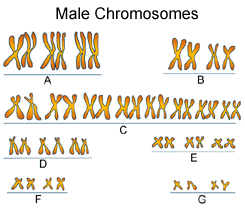 k k Compare the above karyotypes of a normal human male and female. Can you find any differences? Explain these differences in your notes. Hint. In the G set of chromosomes there are two pair of chromosomes. One of the pair in the male karyotype is in the form of XY; whereas, in the female it is XX. These represent the sex chromosomes and in many animals including man determine the sex of the individual. 20. Which of the following statements concerning human karyotypes is not true? The correct answer will send you to the next page.