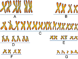 k - human karyotype The figure above represents a human karyotype. Pictures of individual human chromosomes are cut from of a picture taken during metaphase of mitosis and placed in pairs (homologous pair) in relation to their size. As mentioned earlier humans have a total of 46 chromosomes or 23 pairs. 7. If a mother cell with 46 chromosomes enters the G-1 stage how many chromosomes will be in each of the two daughter cells formed at the end of the cycle?