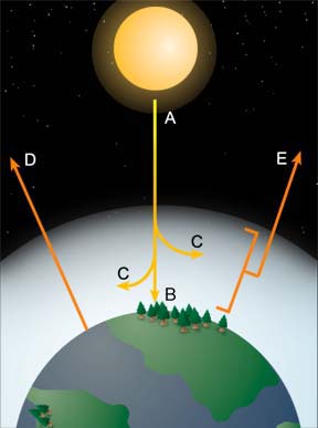 The major factor, therefore, that is involved in producing variations in the biosphere is the amount of radiation that the earth receives from the sun on different parts of the earth's surface. At the equator, the sun's rays are almost perpendicular during most of the year. Therefore, at the equator, one would expect to find higher temperatures but because the earth, tilted on its axis, certain areas of the earth's surface receive much more energy during certain times of the year than during other times of the year. Therefore, both the climate and the temperature are in some way controlled by the tilt of the earth, either toward or away from the sun. This causes the amount of energy reaching the different parts of the earth or its surface to vary hour by hour and season by season. Using the figure located to the below, answer the following questions. E = 141 x 1062 calories / m / yr light energy reflected back from atmosphere C = 94 x 1062 calories / m / yr light energy absorbed by CO2 and H2O in the atmosphere D = 14 x 1062 calories / m / yr reflected back from surface of the earth B = 6 x 1062 calories / m / yr converted into macromolecules by photosynthesis